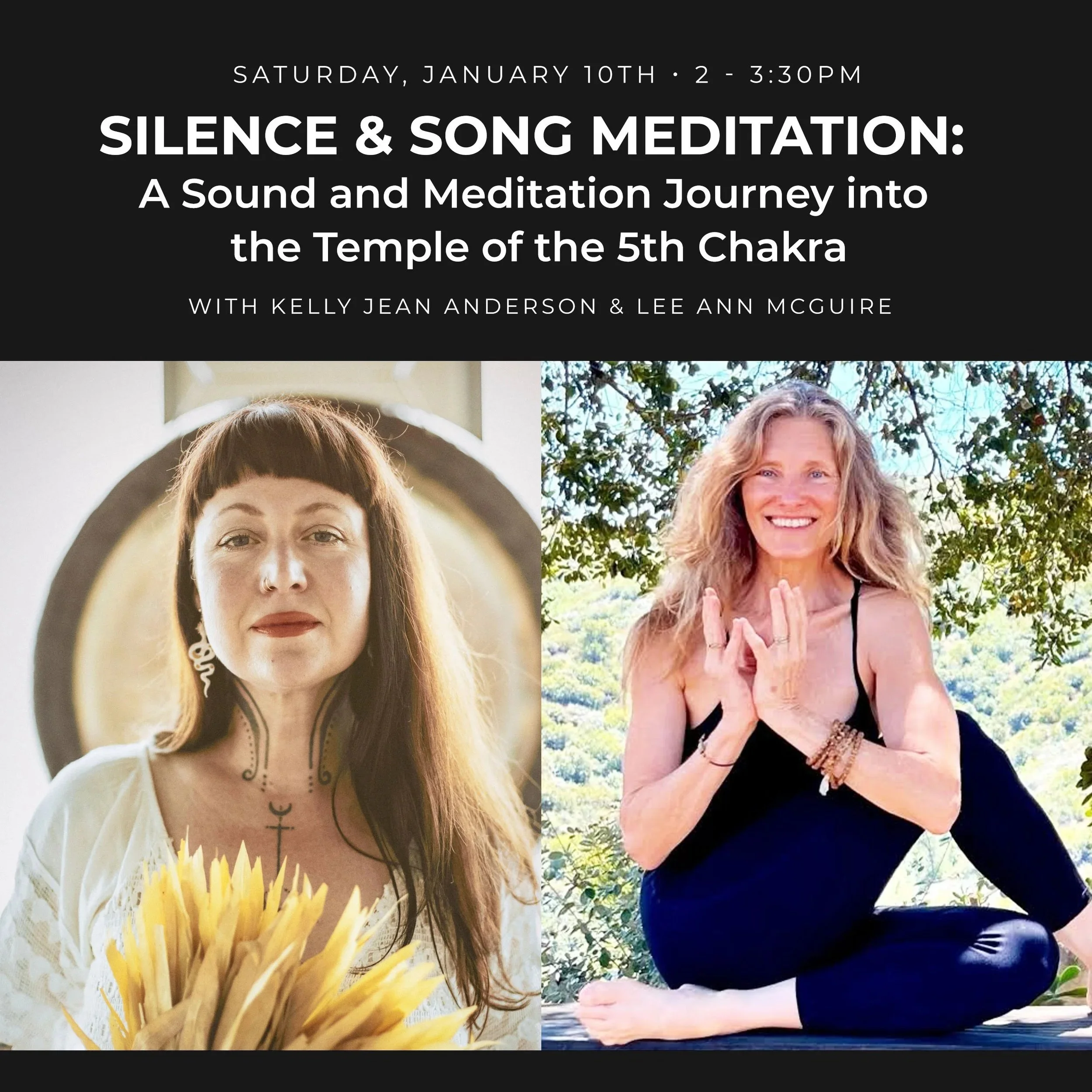 Join ceremonial sound healer Kelly Jean Anderson and yogini Lee Ann McGuire for a workshop on the 5th Chakra. In this gathering of expression we'll practice the teachings of the throat chakra with chanting, mudra's and sound with an invitation for deep meditation. Expect light movement in a space for healing to quieten and listen to what we need to hear through inner silence.